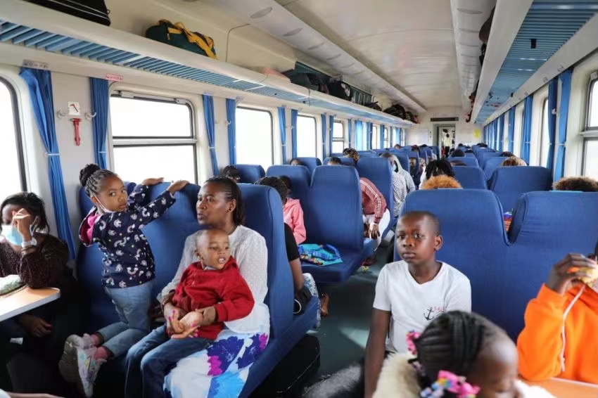 Passengers are seen onboard the train to Mombasa at the Nairobi station of the Mombasa-Nairobi Standard Gauge Railway (SGR) in Nairobi, capital of Kenya, July 05, 2022. (People's Daily/Yan Yunming)