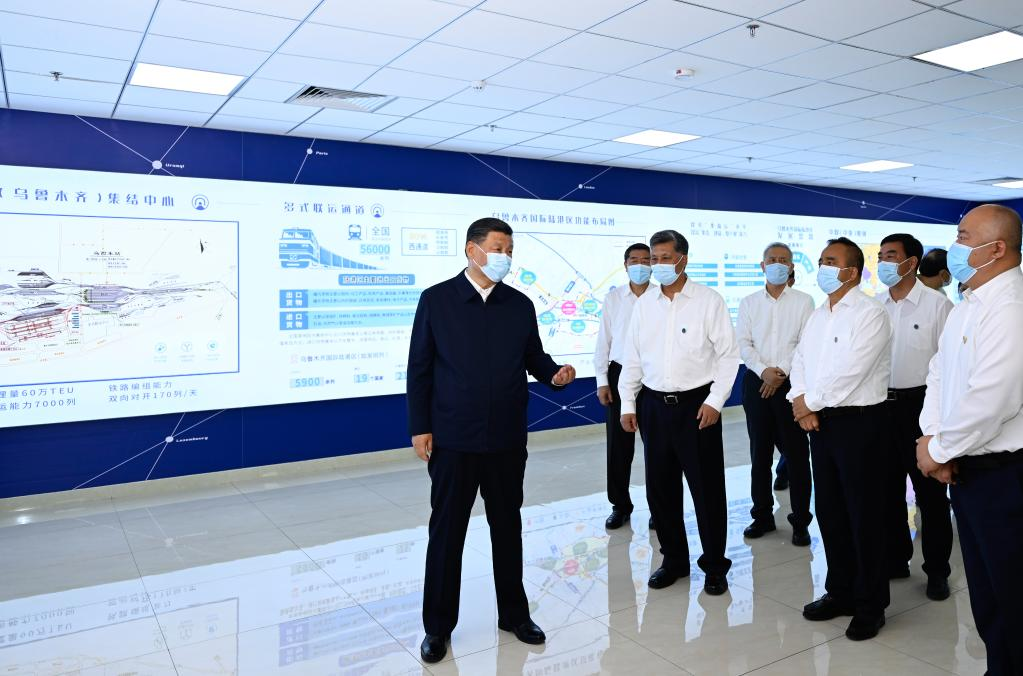 Chinese President Xi Jinping, also general secretary of the Communist Party of China Central Committee and chairman of the Central Military Commission, visits the Urumqi International Land Port Area in the city of Urumqi, capital of northwest China's Xinjiang Uygur Autonomous Region, July 12, 2022. (Xinhua/Li Xueren)