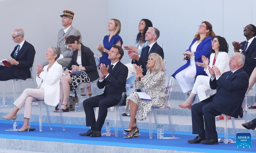 French President Emmanuel Macron (2nd L, front) attends the annual Bastille Day military parade in Paris, France, July 14, 2022. France on Thursday held its annual Bastille Day celebrations with a traditional military parade. (Xinhua/Gao Jing)