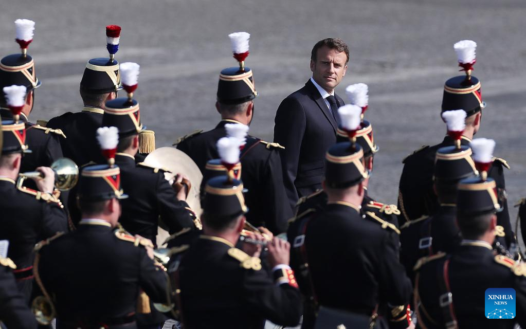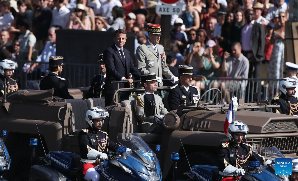 French President Emmanuel Macron attends the annual Bastille Day military parade in Paris, France, July 14, 2022. France on Thursday held its annual Bastille Day celebrations with a traditional military parade. (Xinhua/Gao Jing)