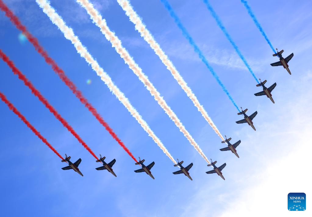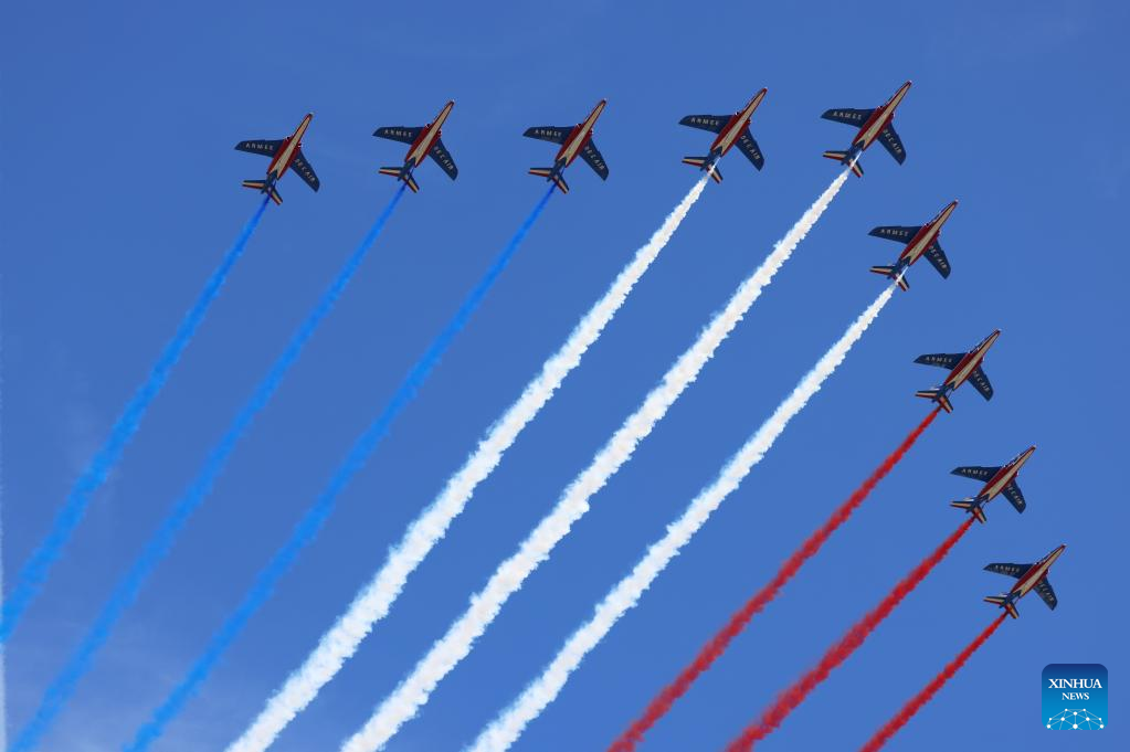 French Air Force Patrouille de France is seen during the annual Bastille Day military parade in Paris, France, July 14, 2022. France on Thursday held its annual Bastille Day celebrations with a traditional military parade. (Xinhua/Gao Jing)