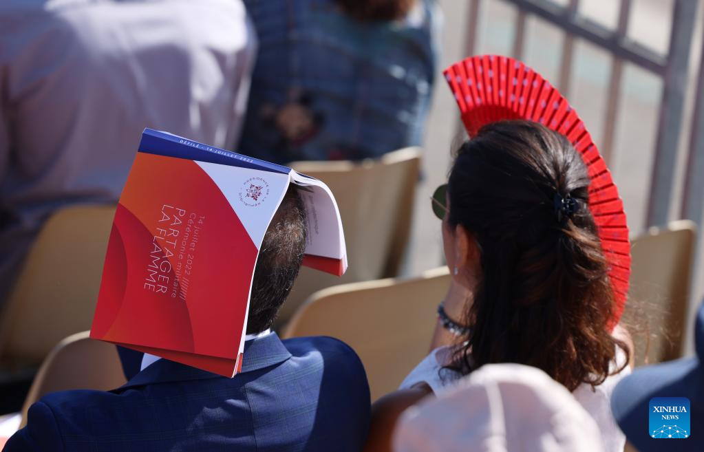 People watch the annual Bastille Day military parade at the Place de la Concorde in Paris, France, July 14, 2022. France on Thursday held its annual Bastille Day celebrations with a traditional military parade. (Xinhua/Gao Jing)