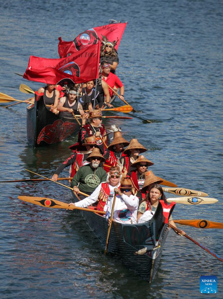 Indigenous canoes are seen in front of Science World during a canoe arrival ceremony in Vancouver, British Columbia, Canada, on July 14, 2022. Indigenous people participated in the canoe arrival ceremony on Thursday to mark the opening of the Sacred Journey exhibition at Science World in Vancouver. The Sacred Journey is an exhibition showcasing Northwest Coast canoe cultures and the indigenous people's way of life. (Photo by Liang Sen/Xinhua)