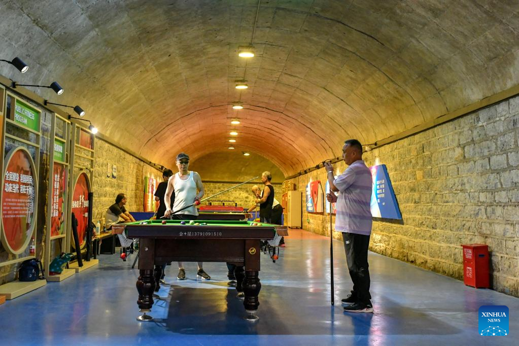 Residents play billiards in an air-raid shelter in Jinan, east China's Shandong Province, July 8, 2022. Due to hot weather this summer, Jinan has opened nine air-raid shelters for free, providing citizens with leisure, reading, sports and fitness services. (Xinhua/Zhu Zheng)