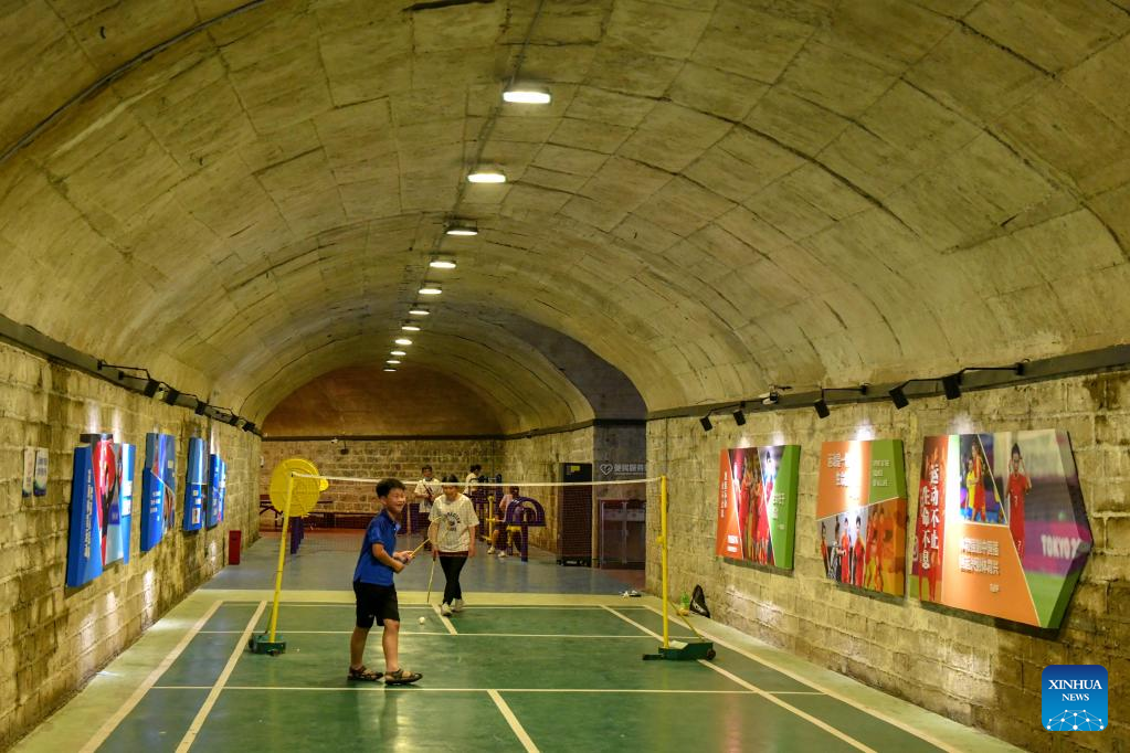 Residents play badminton in an air-raid shelter in Jinan, east China's Shandong Province, July 8, 2022. Due to hot weather this summer, Jinan has opened nine air-raid shelters for free, providing citizens with leisure, reading, sports and fitness services. (Xinhua/Zhu Zheng)