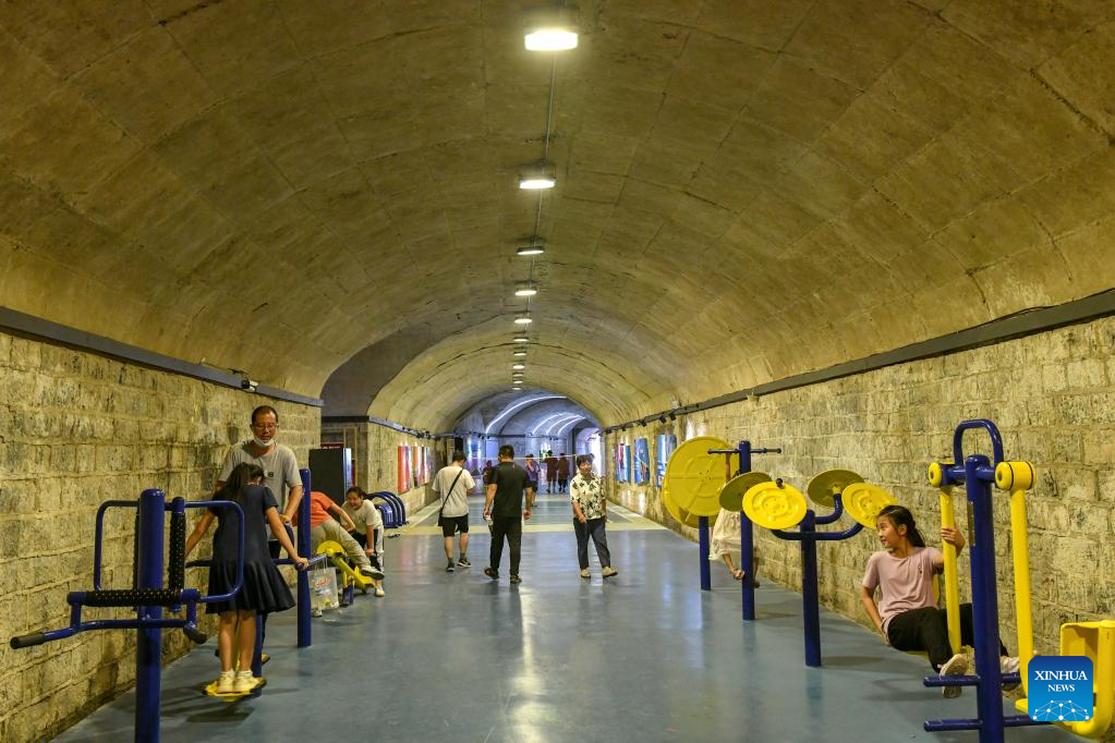 Residents exercise in an air-raid shelter in Jinan, east China's Shandong Province, July 8, 2022. Due to hot weather this summer, Jinan has opened nine air-raid shelters for free, providing citizens with leisure, reading, sports and fitness services. (Xinhua/Zhu Zheng)