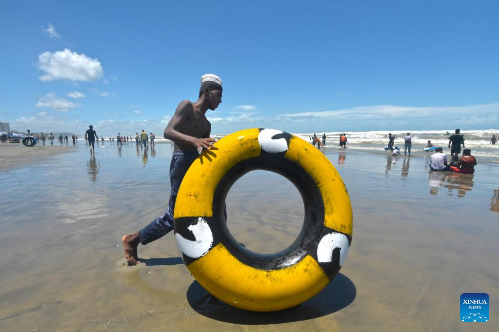 A man moves a make-shift life buoy at a beach during Eid al-Adha holiday in Cox's Bazar, Bangladesh, July 12, 2022. (Xinhua)
