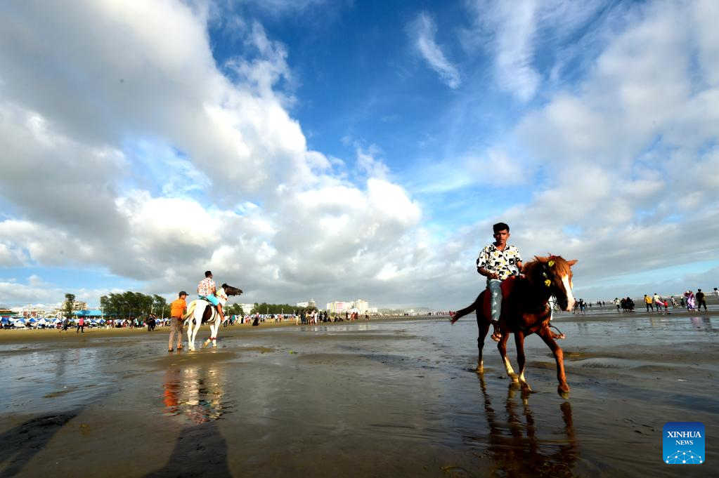 People enjoy horse riding at a beach during Eid al-Adha holiday in Cox's Bazar, Bangladesh, July 12, 2022. (Xinhua)