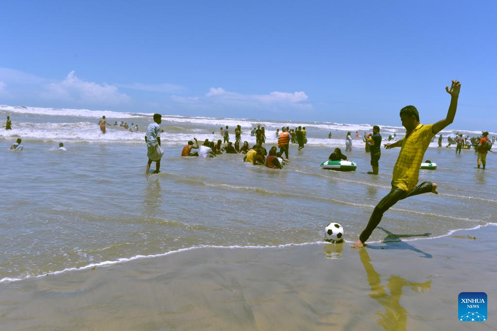 A man plays soccer at a beach during Eid al-Adha holiday in Cox's Bazar, Bangladesh, July 12, 2022. (Xinhua)