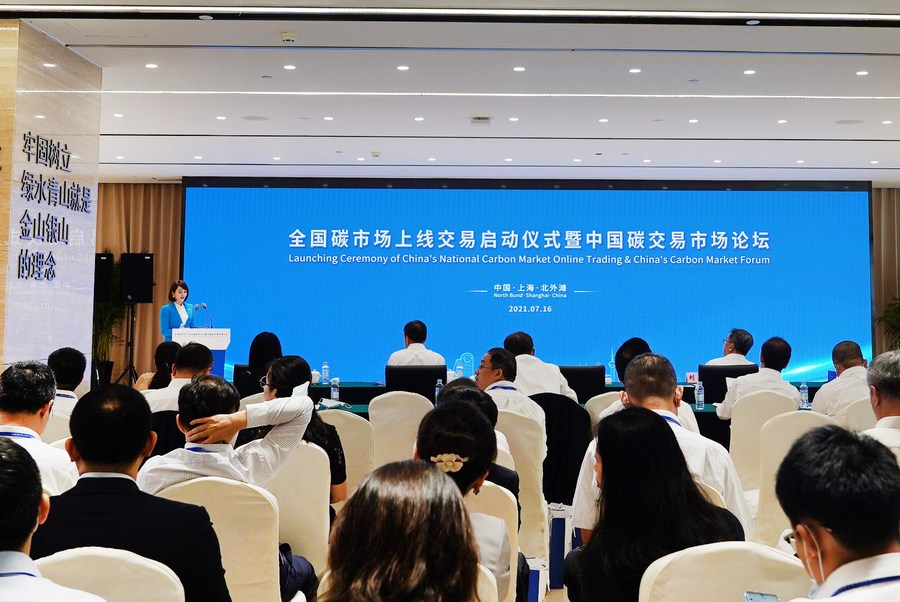 Participants attend the launching ceremony of China's national carbon market online trading and China's Carbon Market forum in east China's Shanghai, July 16, 2021. (Xinhua/Cheng Siqi)