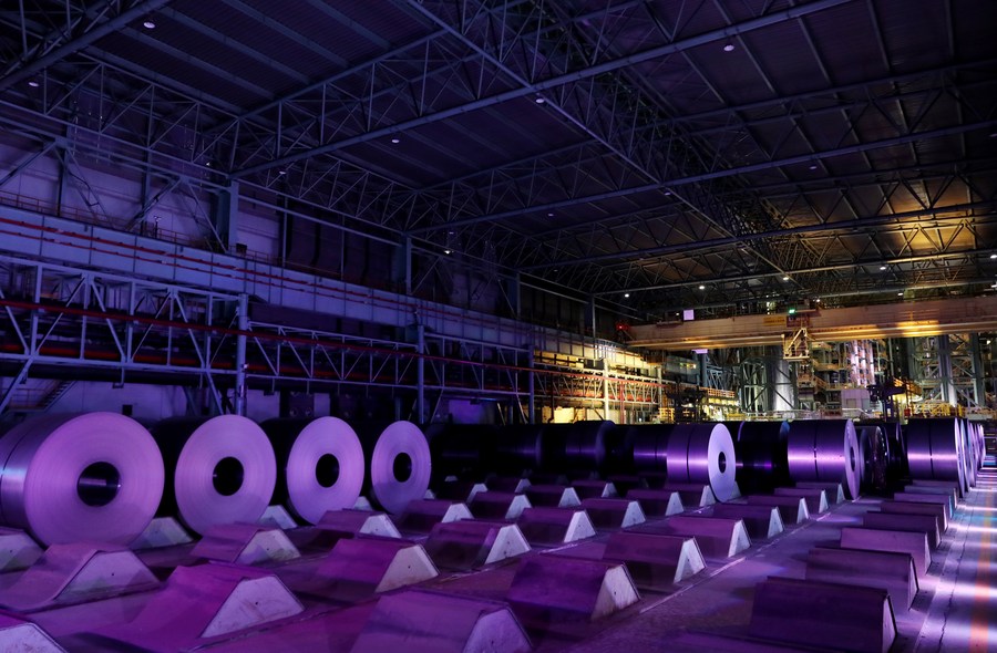 Photo taken on Feb. 8, 2022 shows a view of the intelligent workshop of Baoshan base of China Baowu Steel Group in east China's Shanghai. (Xinhua/Fang Zhe)