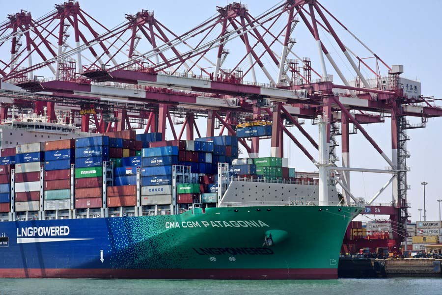 Photo taken on May 1, 2022 shows a container vessel docking at the Qianwan Container Terminal in Qingdao, east China's Shandong Province. (Xinhua/Li Ziheng)