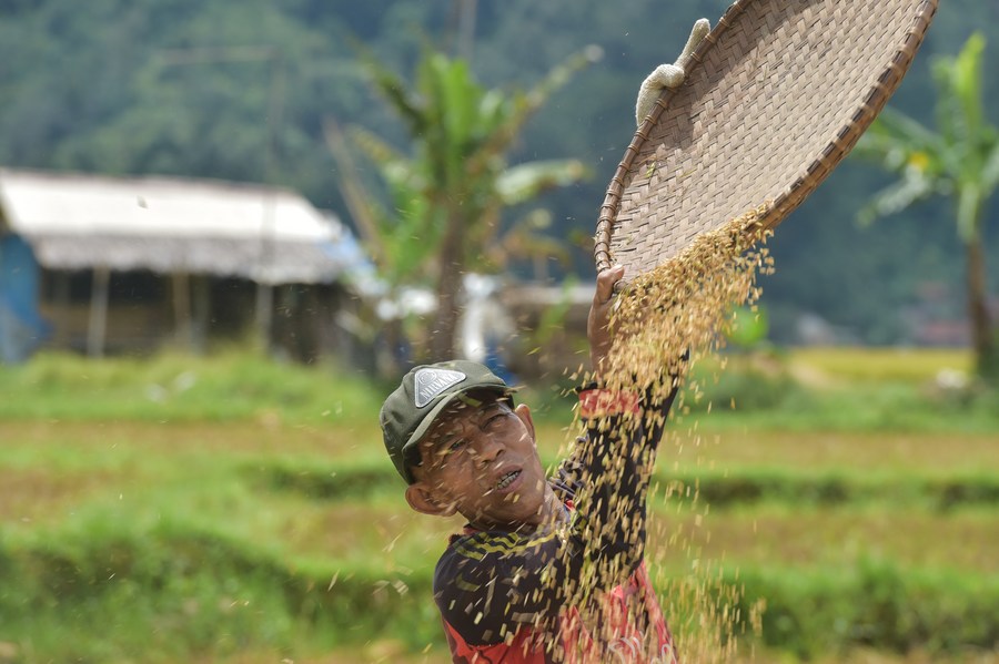 A farmer airs rice in the field at Purasari village of Bogor district in Indonesia, Oct. 19, 2021. (Xinhua/Veri Sanovri)