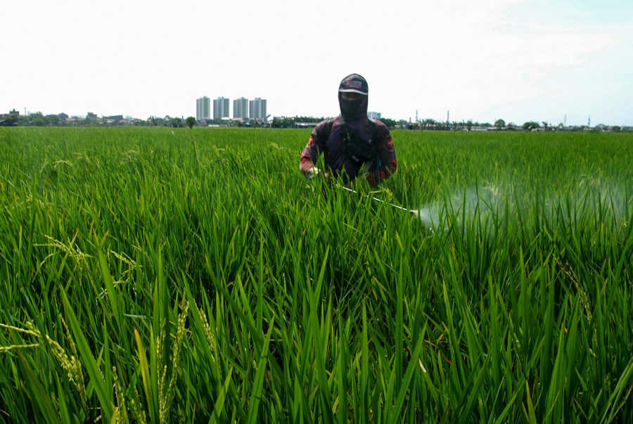 A farmer sprays pesticide in a paddy field in Rorotan village of Jakarta, Indonesia, Feb. 21, 2022. (Photo by Rahmat Dian P./Xinhua)