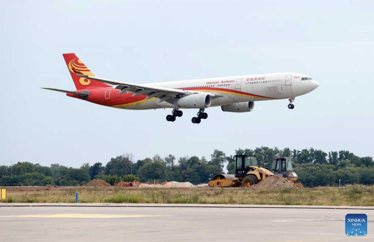 A plane of Hainan Airlines arrives at Nikola Tesla Airport in Belgrade July 16, 2022. China's Hainan Airlines on Saturday opened a direct flight to link Beijing, capital of China, and Belgrade, capital of Serbia. (Photo by Predrag Milosavljevic/Xinhua)
