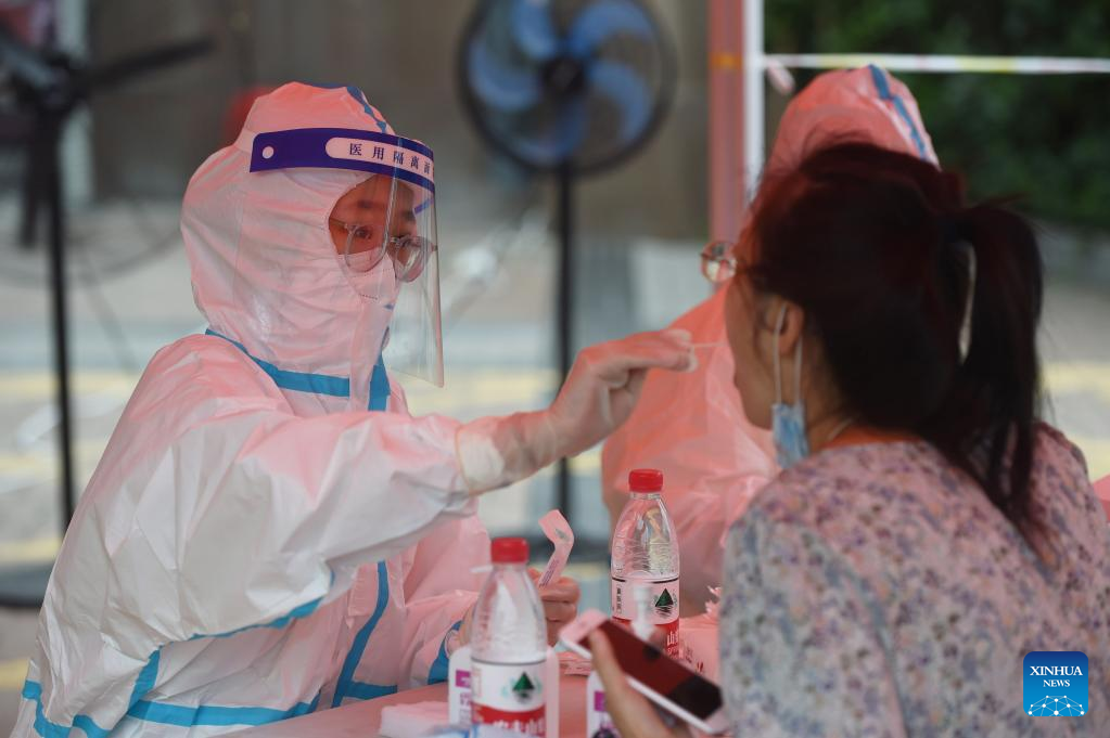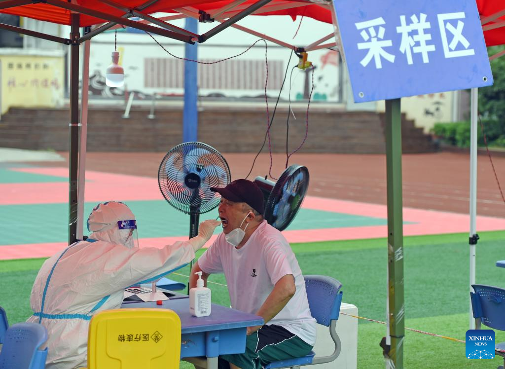 A medical worker takes a swab sample from a citizen for nucleic acid testing in Longzihu District of Bengbu City, east China's Anhui Province, July 17, 2022.