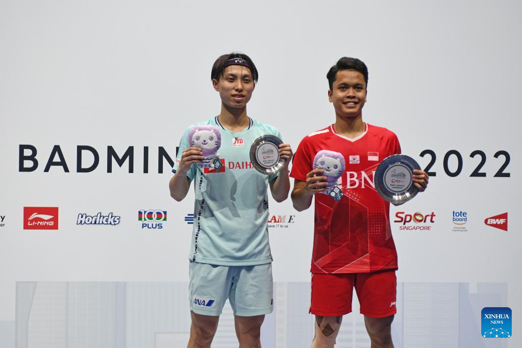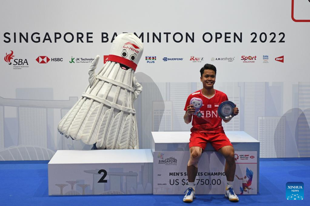 Anthony Sinisuka Ginting of Indonesia poses for photos during the awarding ceremony after winning men's singles final against Naraoka Kodai of Japan at Singapore Open 2022 badminton tournament in Singapore, July 17, 2022. (Photo by Then Chih Wey/Xinhua)