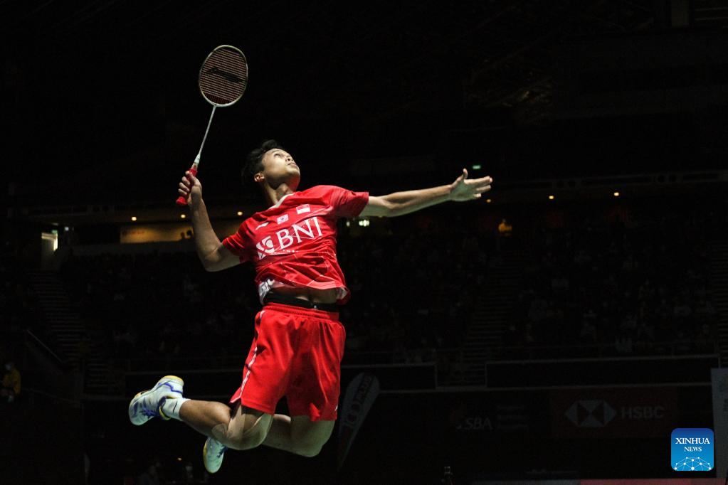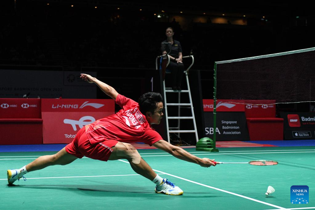 Anthony Sinisuka Ginting of Indonesia hits a return during men's singles final against Naraoka Kodai of Japan at Singapore Open 2022 badminton tournament in Singapore, July 17, 2022. (Photo by Then Chih Wey/Xinhua)