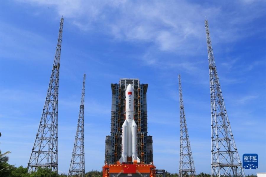 Photo shows the combination of China's space station lab module Wentian and a Long March-5B Y3 carrier rocket being transferred to the launch area, July 18, 2022. (Photo/Xinhua)