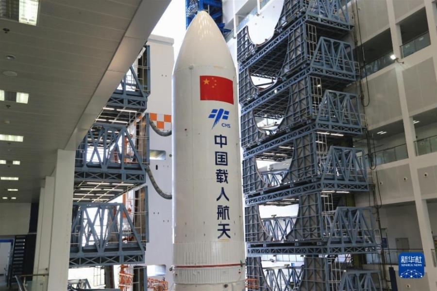 Photo shows the combination of China's space station lab module Wentian and a Long March-5B Y3 carrier rocket being transferred to the launch area, July 18, 2022. (Photo/Xinhua)