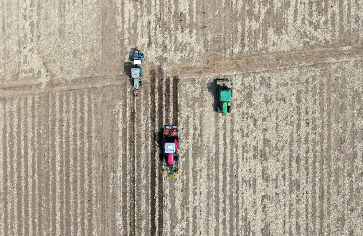 Farmers operate machines to sow seeds in Tieling, Northeast China's Liaoning province, April 9, 2022. [Photo/Xinhua]