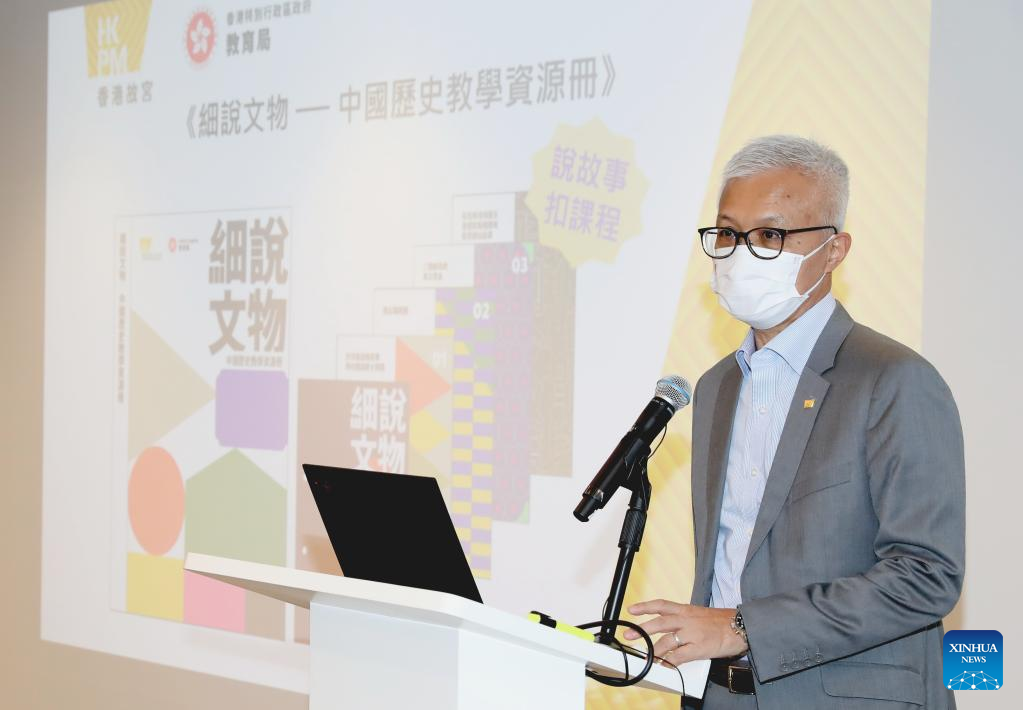 Louis Ng, director of the Hong Kong Palace Museum (HKPM), introduces a book of teaching resources featuring various exhibits of the HKPM in south China's Hong Kong, July 18, 2022. The HKPM has partnered with the Education Bureau (EDB) of the Hong Kong Special Administrative Region (HKSAR) government in publishing a book of teaching resources in an effort to foster a passion for Chinese history and culture among secondary school students, the museum announced Monday. (Xinhua/Wu Xiaochu)
