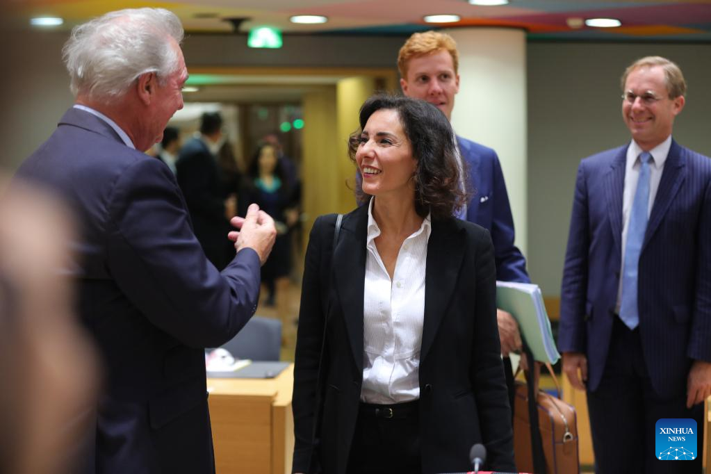Belgium's Minister of Foreign Affairs Hadja Lahbib (C) attends the meeting of the EU Foreign Affairs Council in Brussels, Belgium, July 18, 2022. (Xinhua/Zheng Huansong)