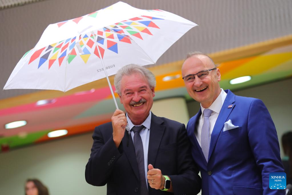 Luxembourg's Minister for Foreign and European Affairs Jean Asselborn (L) and Croatian Foreign Minister Gordan Grlic Radman pose for photos before the meeting of the EU Foreign Affairs Council in Brussels, Belgium, July 18, 2022. (Xinhua/Zheng Huansong)