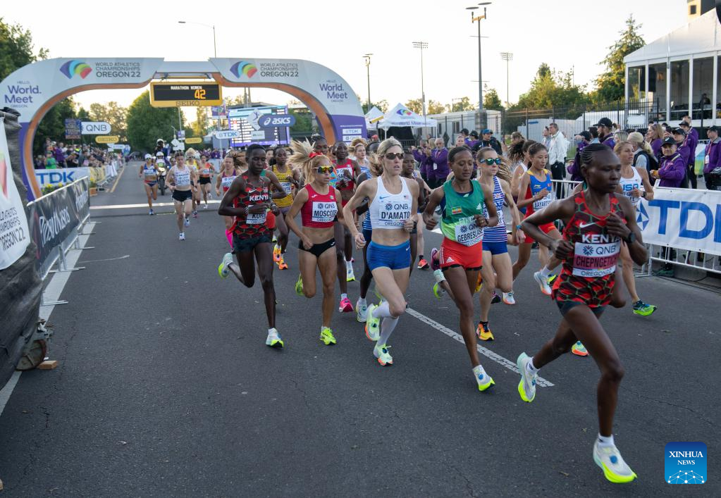 Runners start during the women's marathon final at the World Athletics Championships Oregon22 in Eugene, Oregon, the United States, July 18, 2022. (Xinhua/Wang Ying)