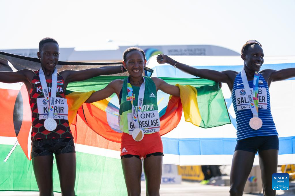 Gold medalist Gotytom Gebreslase (C) of Ethiopia celebrates with silver medalist Judith Jeptum Korir (L) of Kenya and bronze medalist Lonah Chemtai Salpeter of Israel after the women's marathon final at the World Athletics Championships Oregon22 in Eugene, Oregon, the United States, July 18, 2022. (Xinhua/Wang Ying)