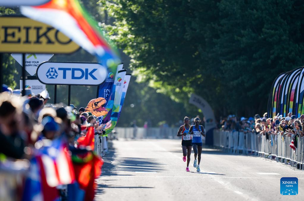 Judith Jeptum Korir (R) of Kenya competes during the women's marathon final at the World Athletics Championships Oregon22 in Eugene, Oregon, the United States, July 18, 2022. (Xinhua/Wang Ying)