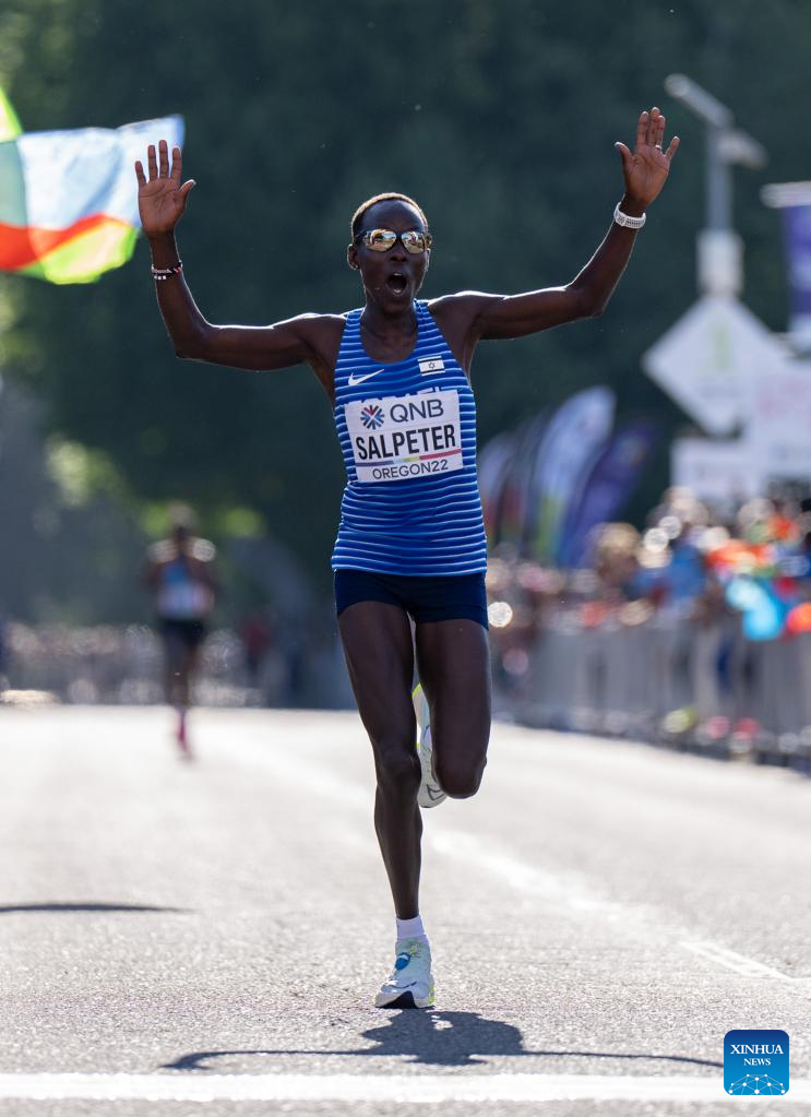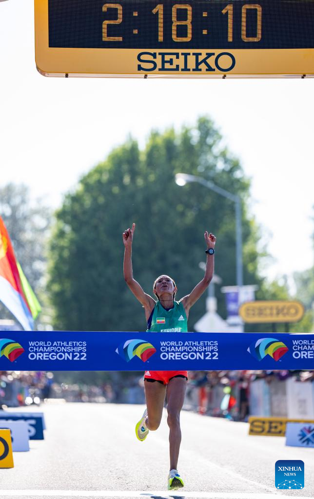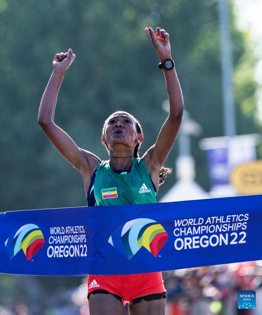 Gotytom Gebreslaseof Ethiopia celebrates after winning the women's marathon final at the World Athletics Championships Oregon22 in Eugene, Oregon, the United States, July 18, 2022. (Xinhua/Wang Ying)