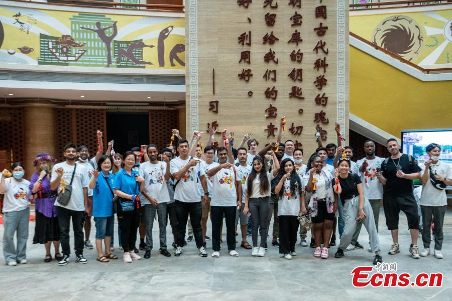 Foreigners show their handmade Chinese sachets during the Bashu themed cultural activity in Meishan city, southwest China's Sichuan Province, July 18, 2022. (Photo: China News Service/Liu Zhongjun)
