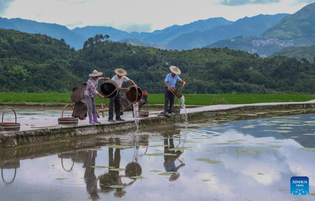 Farmers release fish fry into a rice field in Xiaozhoushan Township, Qingtian County, east China's Zhejiang Province, June 11, 2020.