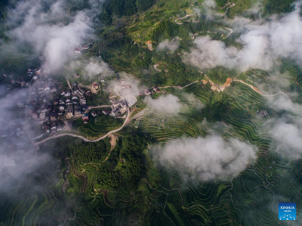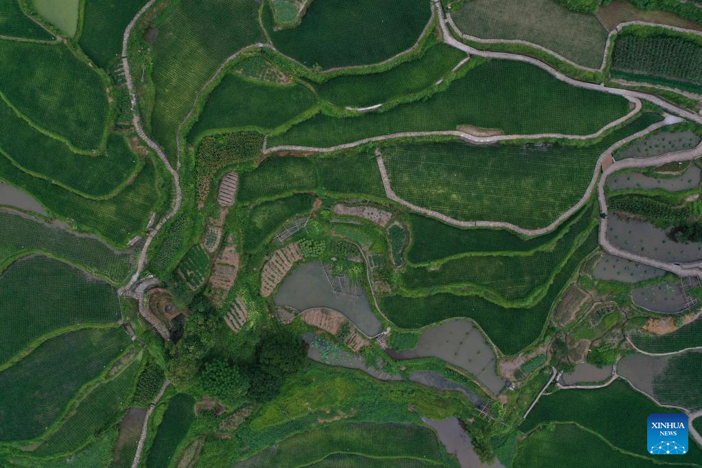 Aerial photo taken on July 25, 2019 shows terraced rice fields in Xiaozhoushan Township, Qingtian County, east China's Zhejiang Province.