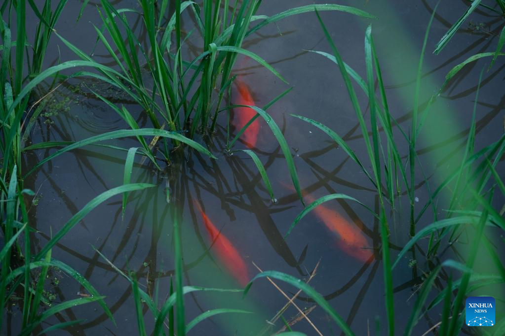 Photo taken on July 18, 2022 shows fish swimming in a protection area of the rice-fish co-culture system in Qingtian County, east China's Zhejiang Province.