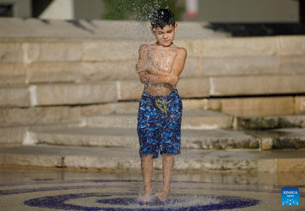 A boy cools off at a splash pad in San Antonio, Texas, the United States, on July 18, 2022. More than 100 million people are currently under heat related warnings and advisories across the United States, the National Weather Service (NWS) Weather Prediction Center said on Tuesday. (Photo by Nick Wagner/Xinhua)