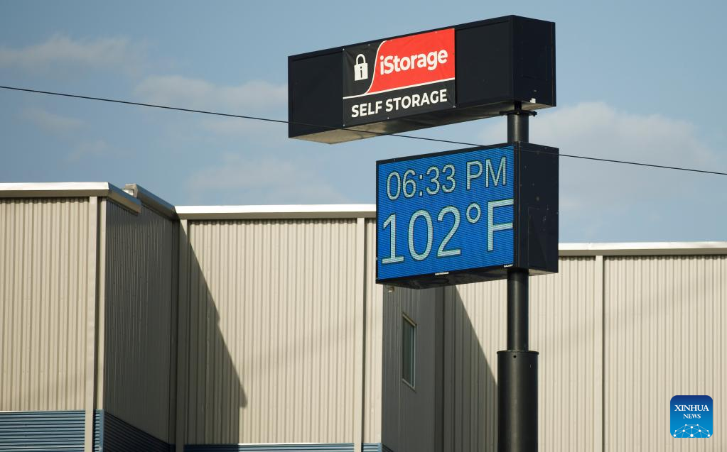 A sign reads the temperature at 102 degrees Fahrenheit in San Antonio, Texas, the United States, on July 18, 2022. More than 100 million people are currently under heat related warnings and advisories across the United States, the National Weather Service (NWS) Weather Prediction Center said on Tuesday. (Photo by Nick Wagner/Xinhua)