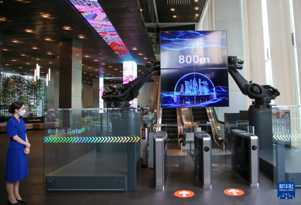 Robots display a "future city" through movable screen at T.um, a new ICT (information and communications technologies) experience center in Seoul, South Korea, July 19, 2022. Located in Seoul, T.um is an experiential exhibition hall to show the future by the convergence of ICT and industry. (Xinhua/Wang Yiliang)