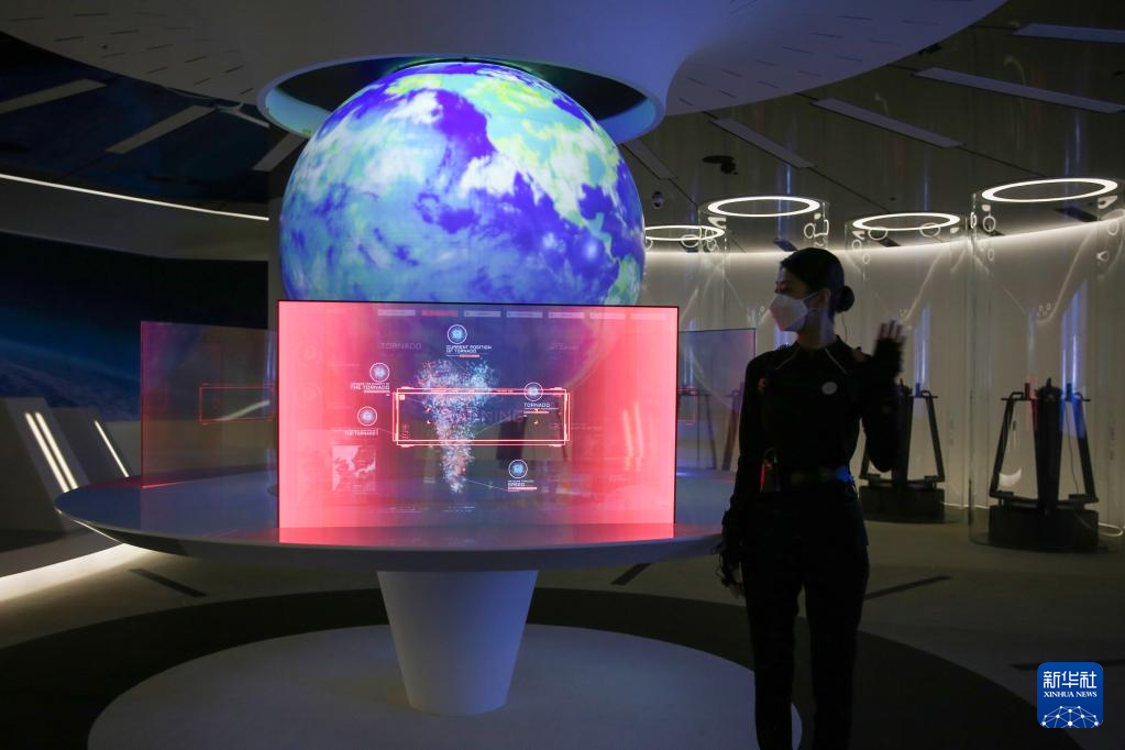 A guide explains a "space control center" which monitors the environment of space and Earth, and ecosystem of the Earth (virtual future scene), at T.um, a new ICT (information and communications technologies) experience center in Seoul, South Korea, July 19, 2022. Located in Seoul, T.um is an experiential exhibition hall to show the future by the convergence of ICT and industry. (Xinhua/Wang Yiliang)