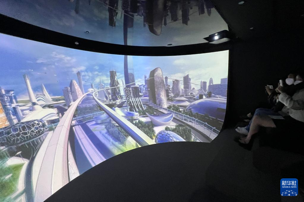 Visitors ride a "flight shuttle" to visit the "future city" at T.um, a new ICT (information and communications technologies) experience center in Seoul, South Korea, July 19, 2022. Located in Seoul, T.um is an experiential exhibition hall to show the future by the convergence of ICT and industry. (Xinhua/Wang Yiliang)
