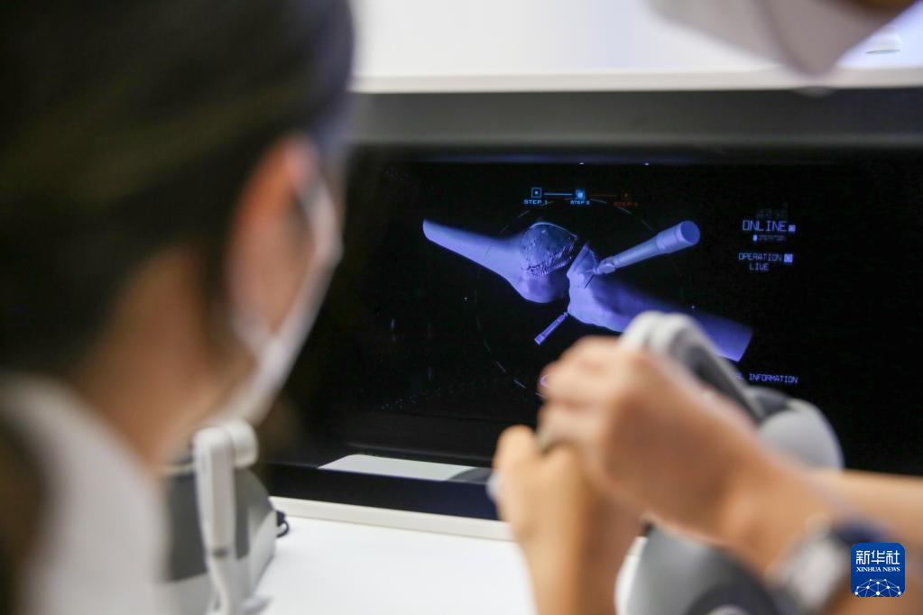 A visitor operates a device to conduct bone transplanting at the medical room aboard the "space shuttle" (a virtual mission) at T.um, a new ICT (information and communications technologies) experience center in Seoul, South Korea, July 19, 2022. Located in Seoul, T.um is an experiential exhibition hall to show the future by the convergence of ICT and industry. (Xinhua/Wang Yiliang)