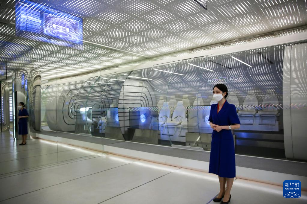 A guide explains the Hyperloop, a proposed high-speed transportation system, at T.um, a new ICT (information and communications technologies) experience center in Seoul, South Korea, July 19, 2022. Located in Seoul, T.um is an experiential exhibition hall to show the future by the convergence of ICT and industry. (Xinhua/Wang Yiliang)