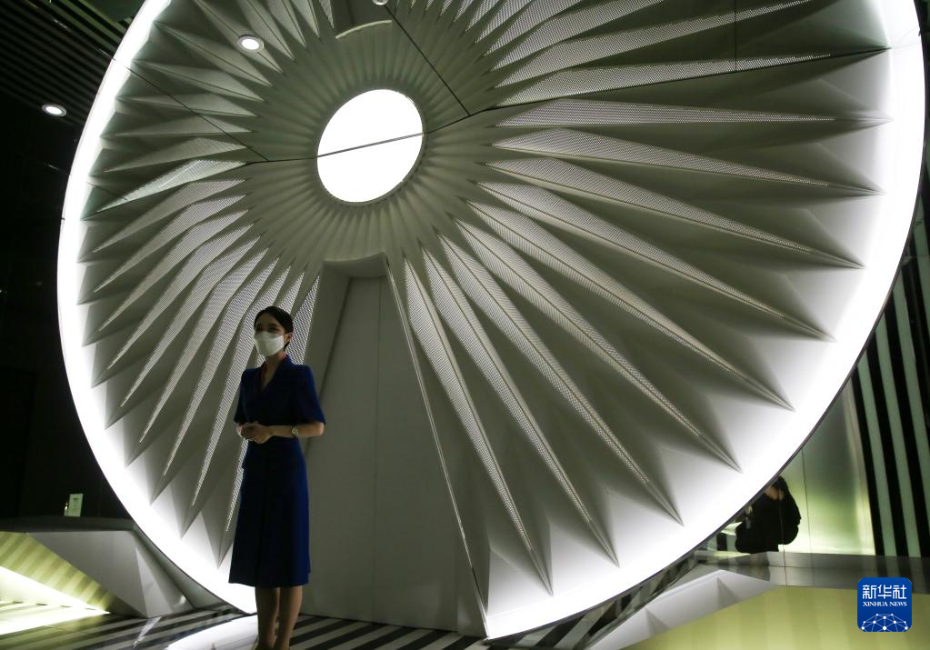 A guide explains a "flight shuttle" at T.um, a new ICT (information and communications technologies) experience center in Seoul, South Korea, July 19, 2022. Located in Seoul, T.um is an experiential exhibition hall to show the future by the convergence of ICT and industry. (Xinhua/Wang Yiliang)