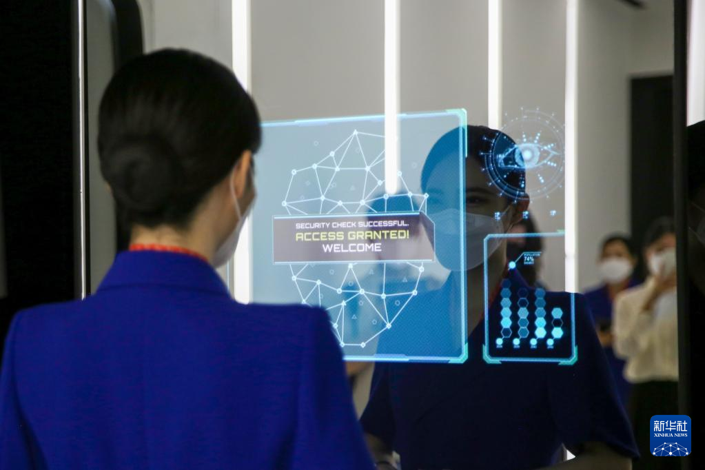 A guide uses facial recognition to unlock the door of a "space shuttle" at T.um, a new ICT (information and communications technologies) experience center in Seoul, South Korea, July 19, 2022. Located in Seoul, T.um is an experiential exhibition hall to show the future by the convergence of ICT and industry. (Xinhua/Wang Yiliang)