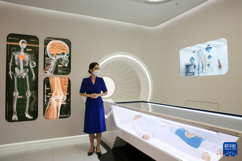 A guide explains an artificial intelligence doctor at the medical room aboard the "space shuttle" at T.um, a new ICT (information and communications technologies) experience center in Seoul, South Korea, July 19, 2022. Located in Seoul, T.um is an experiential exhibition hall to show the future by the convergence of ICT and industry. (Xinhua/Wang Yiliang)