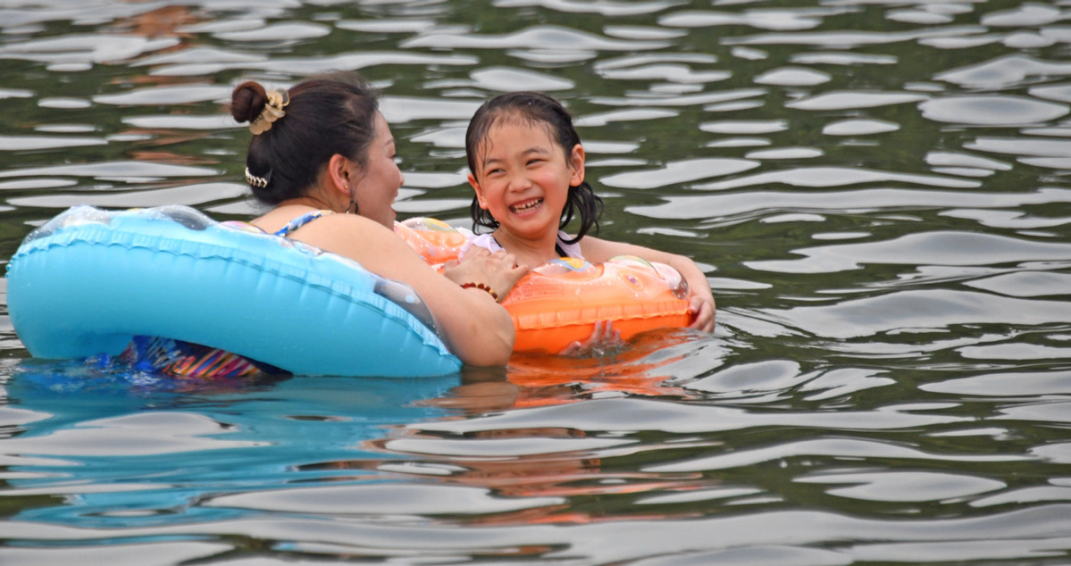 Photo taken on July 16, 2022 shows people playing in water in Xianju county of Taizhou city, East China's Zhejiang province. [Photo/Xinhua]