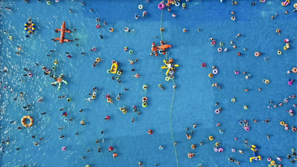Aerial photo taken on July 16, 2022 shows people playing at a water park in Zunhua city, North China's Hebei province. [Photo/Xinhua]