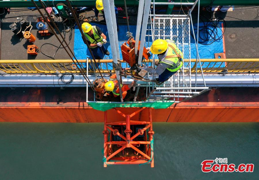 Replacement work of 280 cables on Xiling Yangtze River bridge is underway in Yichang, central China's Hubei Province, July 19, 2022. (Photo: China News Service/Tang Wei)