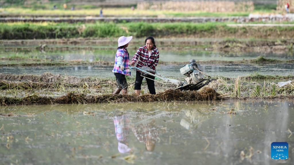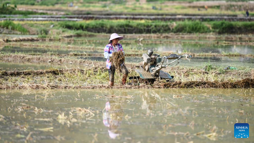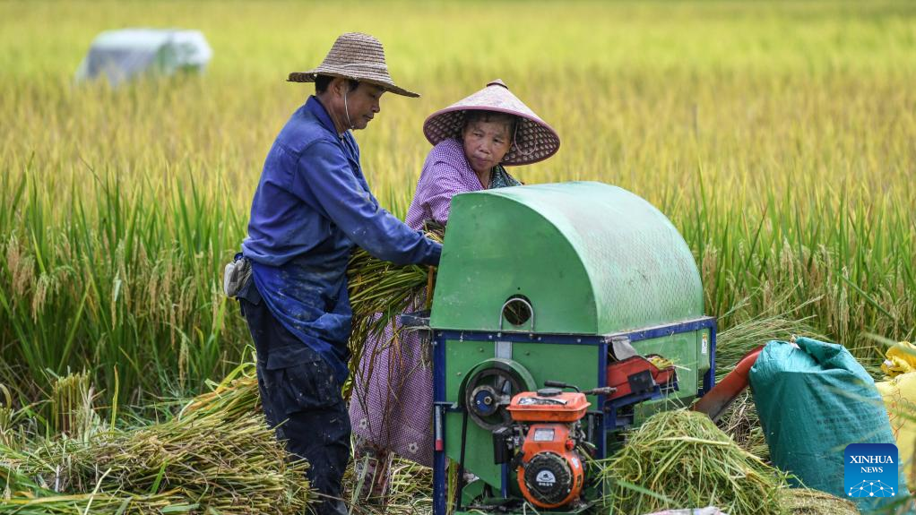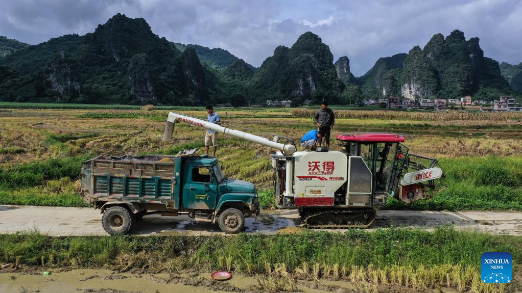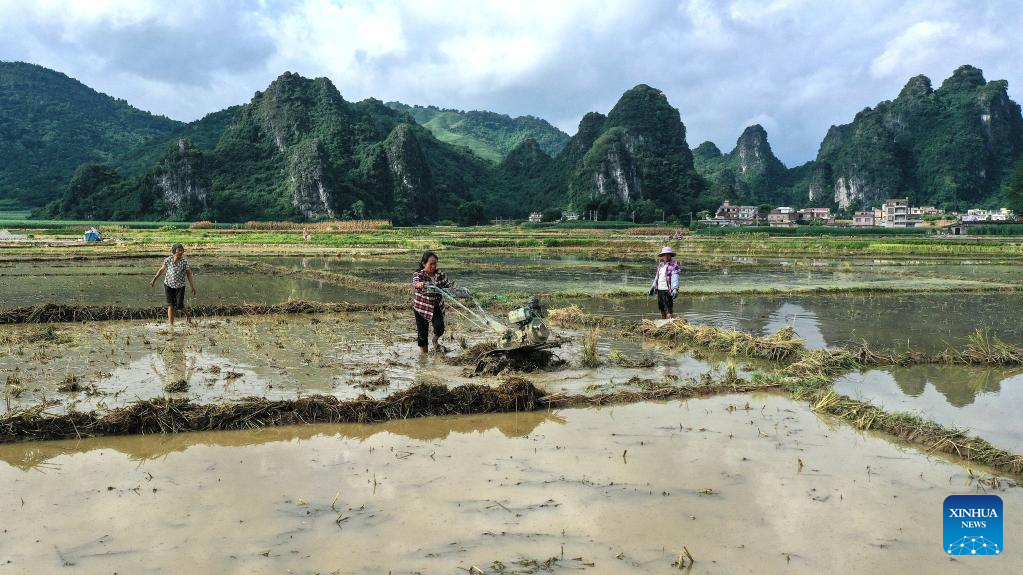 Farmers work in a paddy field in Longkou Village, Dahua Yao Autonomous County, south China's Guangxi Zhuang Autonomous Region, July 20, 2022. (Xinhua/Zhang Ailin)